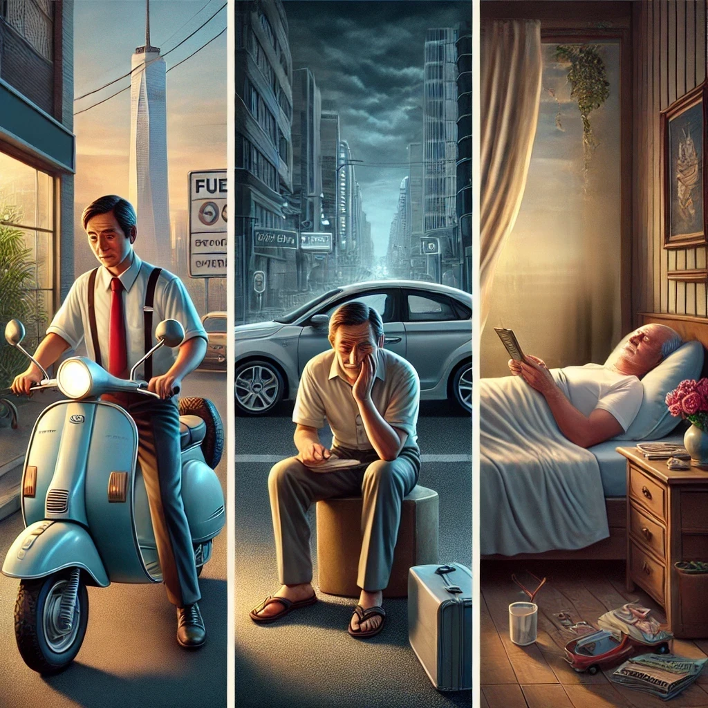 - A clerk dreams of owning a scooter, believing it will make his life easier. But when he buys it, the joy is short-lived. Soon, he worries about fuel costs, repairs, and upgrades.