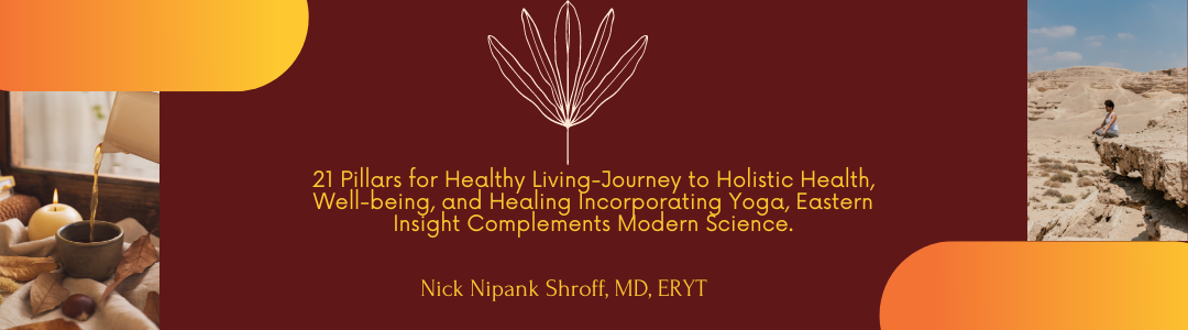 Incorporating healthy living pillars is crucial for overall well-being, including physical, mental, emotional, and social health. Exercise and diet are essential, but other pillars such as sleep, healthy relationships, proper breathing, and restful meditation are also essential for optimal health and happiness. Good health is not alone by nutritious foods, vitamins, and medicines. It also comes from peace of mind and the soul and is magnified by laughter and love. A well-integrated approach to health using all the tools in the toolbox can transform sick care into restorative care. Complement modern medicine with the benefits of yoga, pranayama, and meditation to optimize wellness. Stress and psychological problems can weave into our health, and a holistic approach can help optimize wellness.