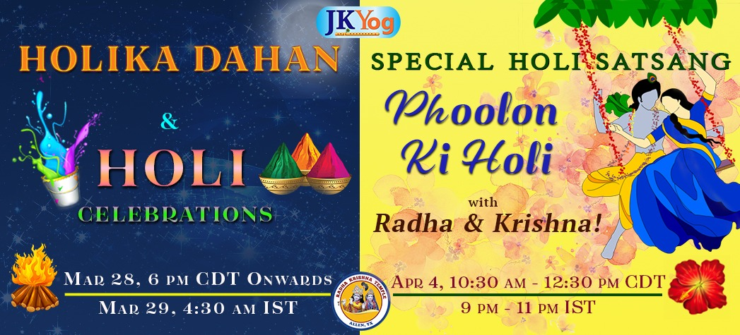 JKYog & Radha Krishna Temple of Dallas brings to the Dallas Metropolitan Area and Worldwide, the most awaited event of the year - Holi 2021 on Sun March 28th, 2021 and Sun Apr 4th, 2021 !