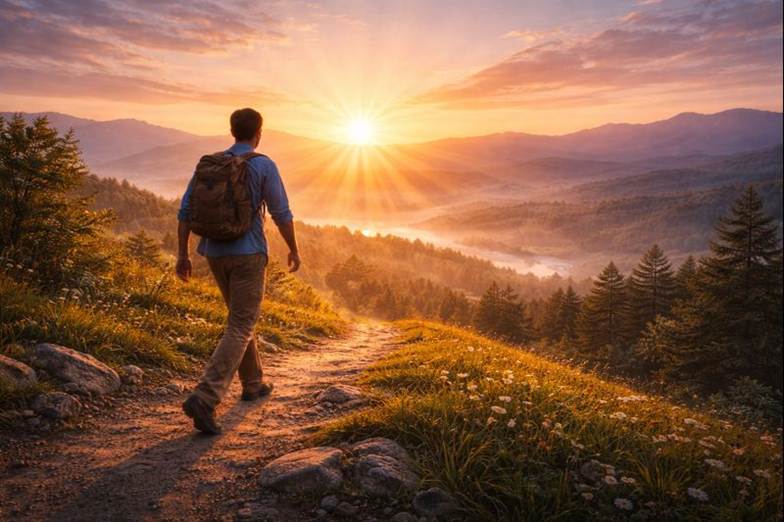 Visualize the Sun rising behind you as you take a bold yet centered professional step forward.