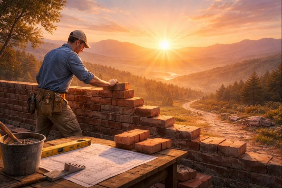 Visualize yourself by laying strong bricks one by one, creating a stable foundation illuminated by steady sunlight.