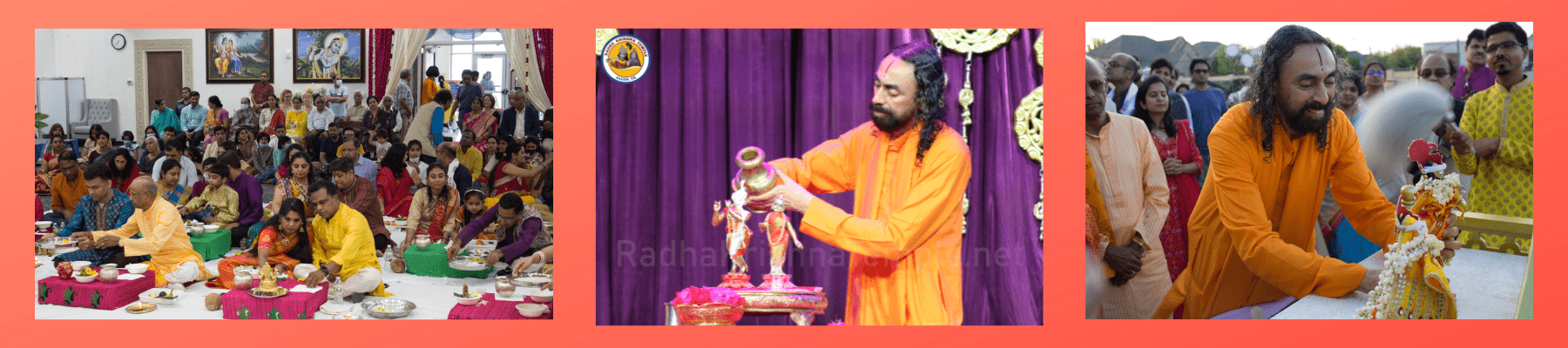 The entire Prayer Hall was filled with devotees who relished every minute of the devotional poojas. The beautiful Abhishek of Radha-Krishna by Swamiji and other devotees and brining the Utsav deities into the Temple's courtyard while singing and dancing, made the entire event so memorable.