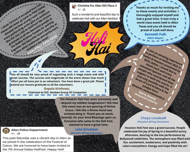 The HoliFest celebration was enjoyed by all the participants – city officials, sponsors, celebrities and volunteers. Here’s a glimpse of a few testimonials.
