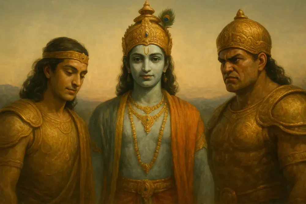 Blinded by arrogance, these brothers rejected the authority of dharma, denied the existence of God, and declared themselves as the ultimate rulers of the universe. Their hearts were devoid of humility and reverence, echoing the very traits Krishna warns about — pride, hypocrisy, cruelty, and delusion.