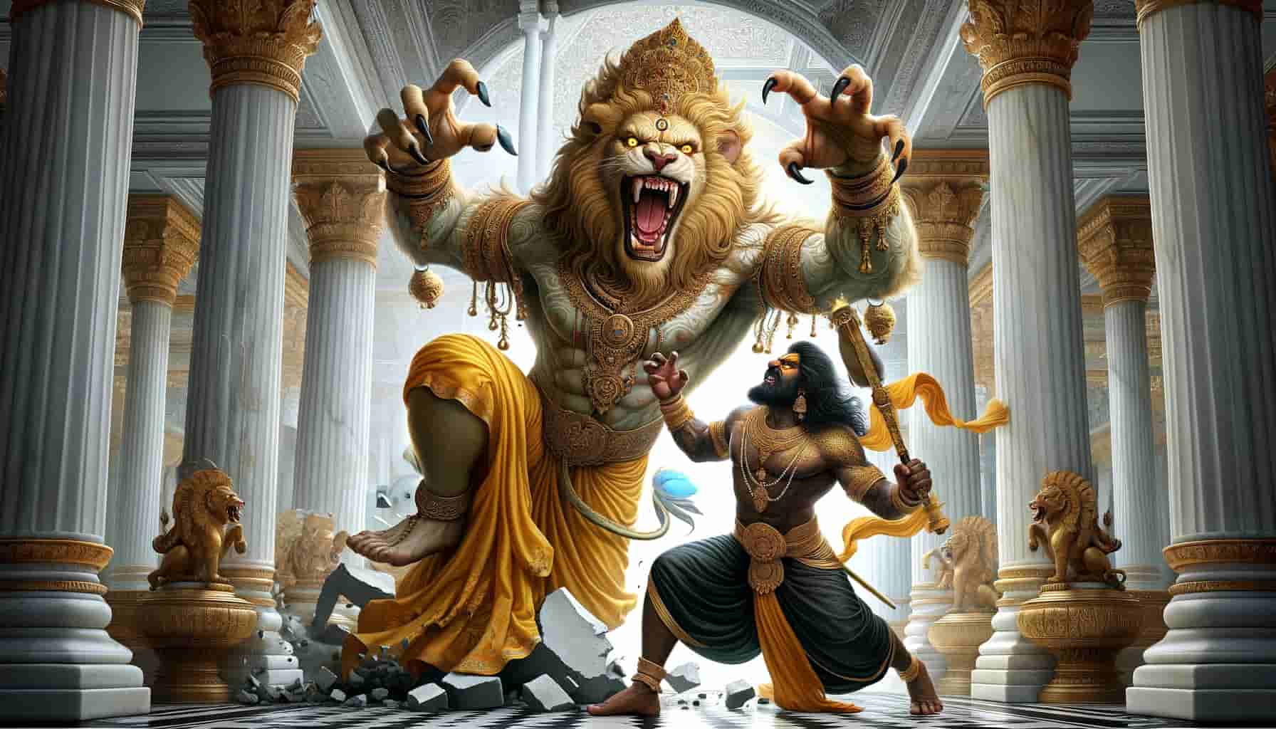 Enraged, Hiranyakashipu struck the pillar, and in that very moment, emerged the most awe-inspiring and terrifying form of the Lord — Narasimha, the half-man, half-lion incarnation. He was neither man nor beast, and He appeared at twilight (neither day nor night), on the threshold of the palace (neither inside nor outside), placed Hiranyakashipu on His lap (neither earth nor sky), and slew him with His nails (not a weapon).