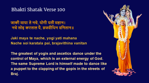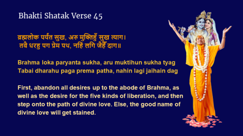 Shree Maharajji has said that the Bhakti Shatak is like the Mansarovar of Braj where we are like the swans who absorb the sweet ras of divine love. The sweetness of the Braj Ras is incomparable because in Braj, the Supreme Lord Shree Krishna sheds His almightiness and becomes one of us. It is here that the Gopis make him dance for buttermilk or put little balls of cow dung on His face as a measure of the amount of work done in exchange for butter. This happens only when the devotees are totally selfless with not an ounce of selfish desire, not even for liberation. The land of Braj is where love dominates. All the residents in Braj are devotees of Shree Krishna who practice Raganuga Bhakti (i.e., loving devotional sentiments not dictated by rituals) instead of Vedic Bhakti (i.e., ritualistic, often devoid of devotion).