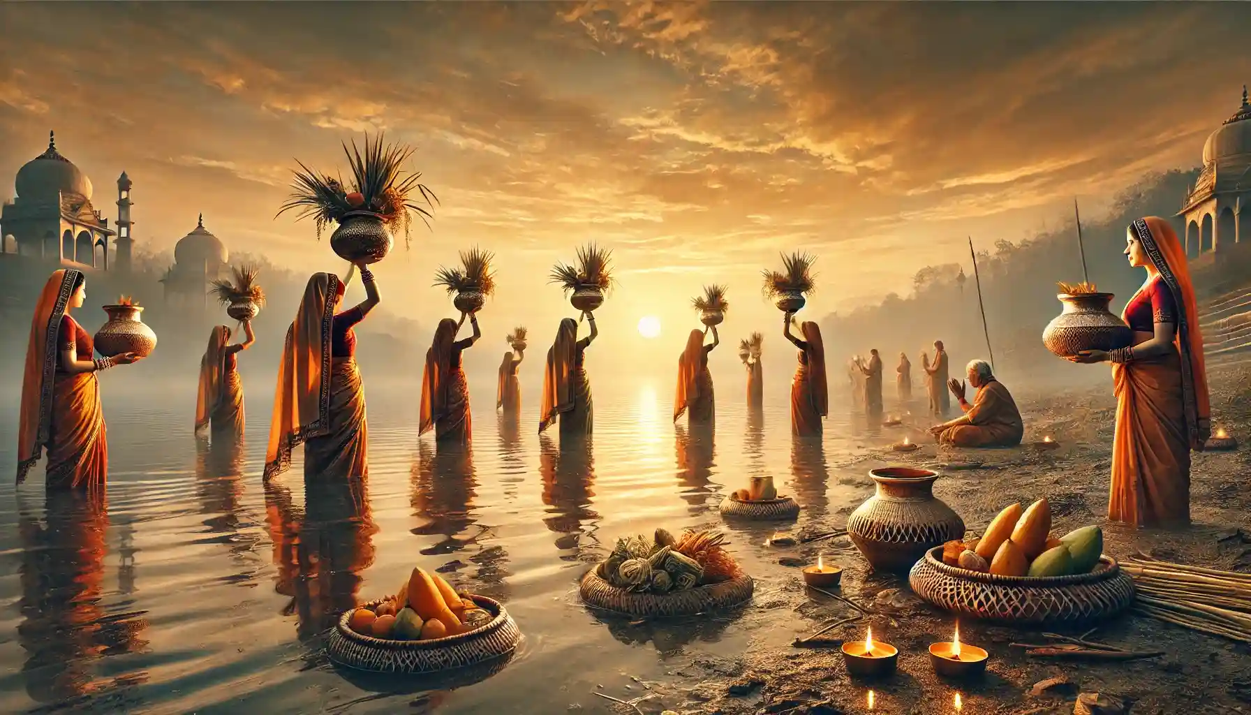- Standing in water, devotees offer Arghya to the setting sun while chanting folk songs and mantras.