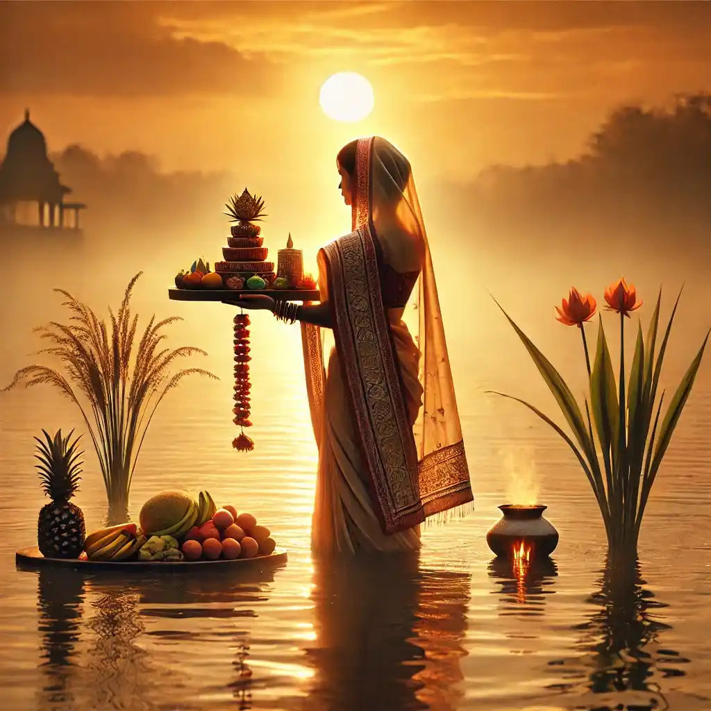 | Day 3: Sandhya Arghya | Oct 27, 2025 | Offerings to the setting sun while standing in water. Prasad includes thekua, fruits, and sugarcane in a soop (bamboo tray). | Represents surrender, gratitude, and acceptance of life’s impermanence and duality. |