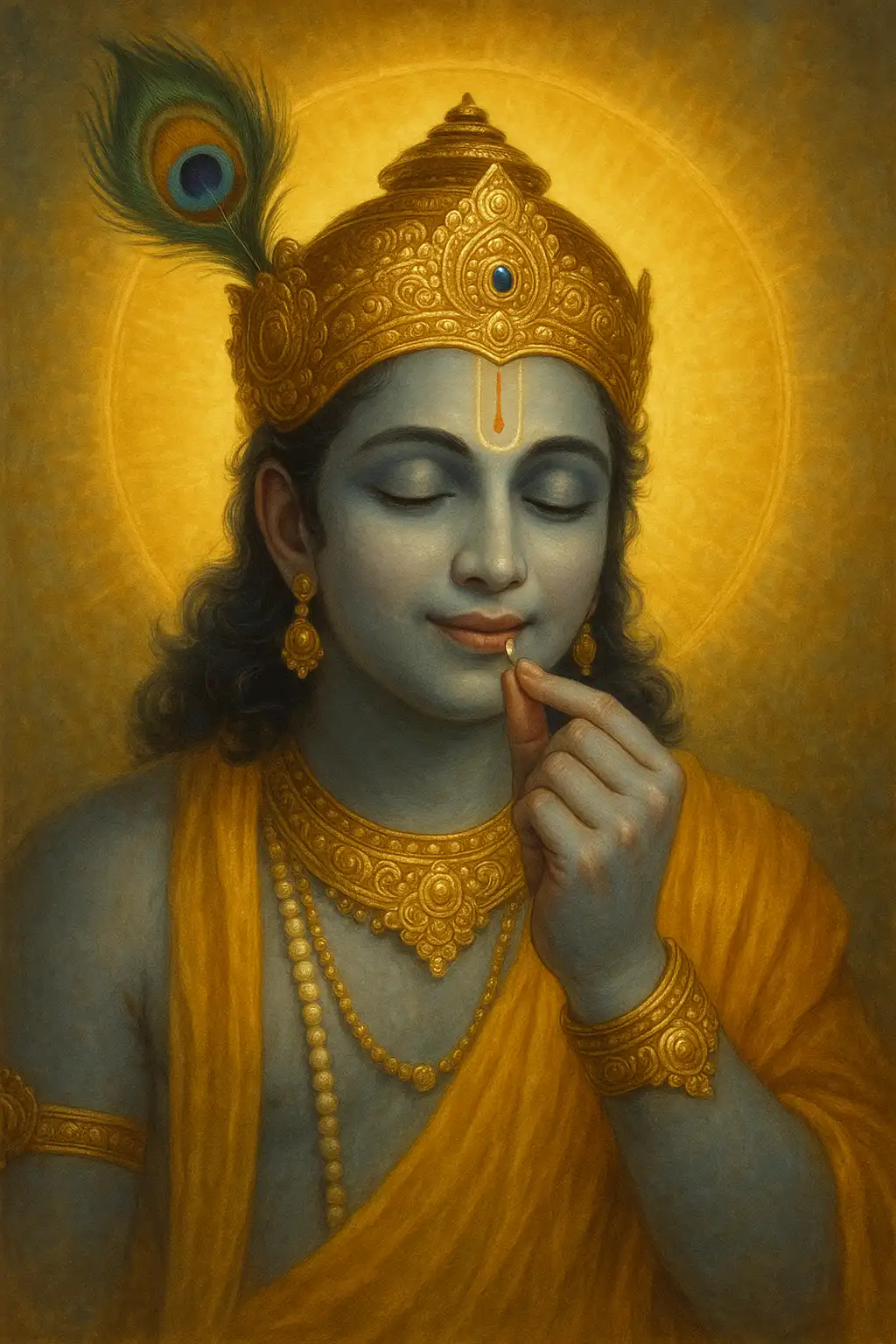 When Krishna took the vessel in His hands, He noticed a single grain of rice and a small leaf clinging to its side. With great love and satisfaction, Krishna placed the grain in His mouth and ate it. Then, with a contented smile, He declared that by eating that one grain, He had become completely satisfied — and with Him, the entire universe was satiated.