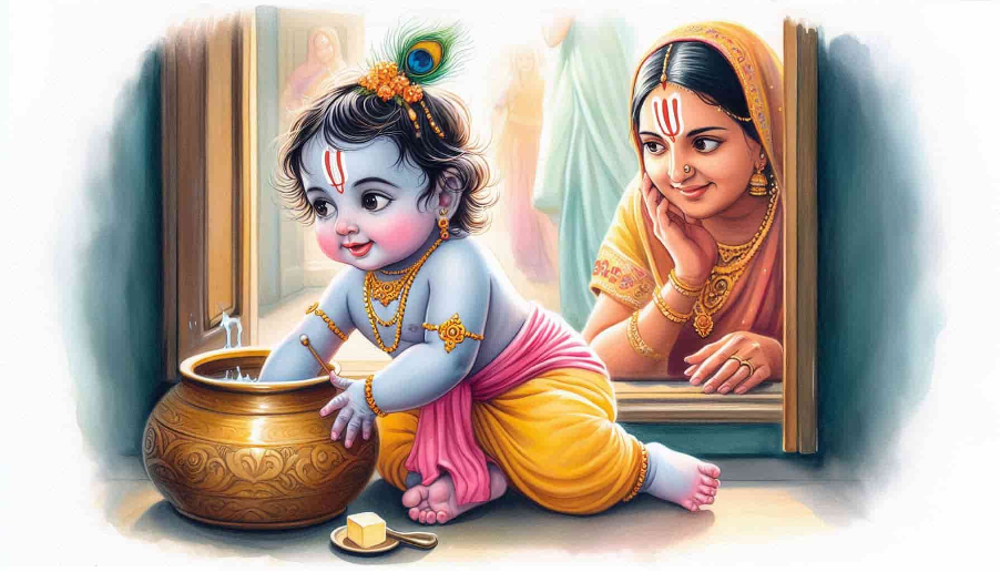 The saga began at home with Mother Yashoda. While she busied herself with chores, little Shree Krishna would crawl away, searching for butter. One day, when she left Him alone briefly for a puja, Shree Krishna snuck into the storage room, found the butter, and began eating it.