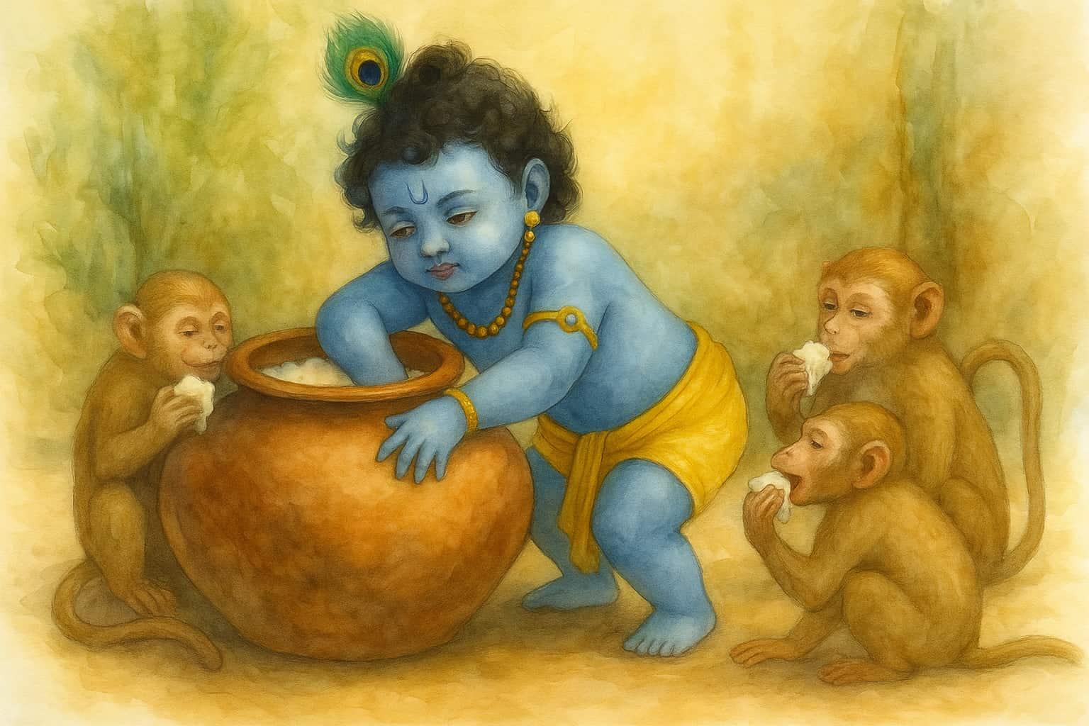 With divine mischief, He grabbed the churning rod and began creating chaos—breaking pots and splashing yogurt. Then, in a loving rebellion, He took the butter and fed it to the monkeys.