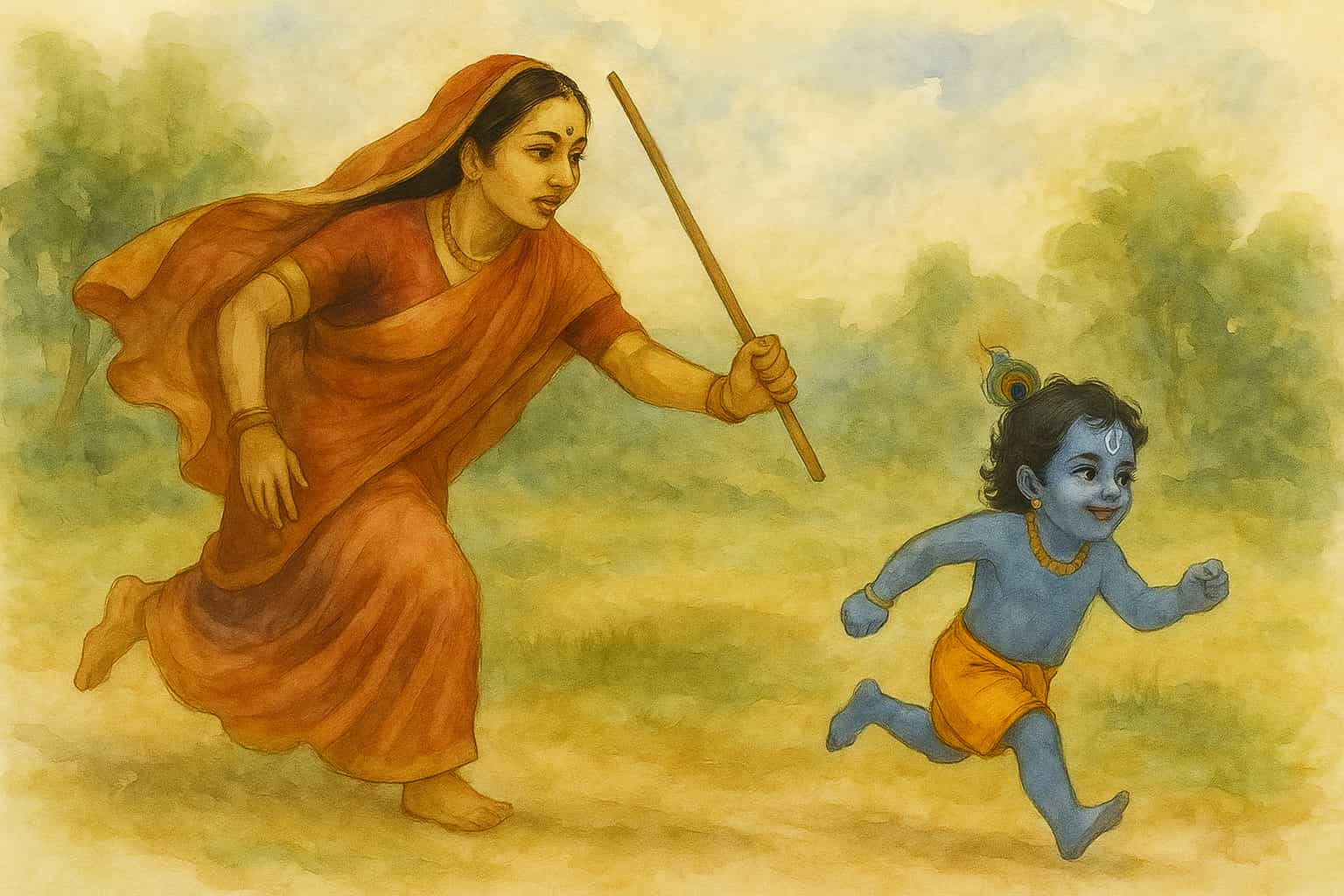 Shree Krishna dropped the butter and ran. Yashoda, though larger, could barely catch up with the tiny toddler, who swerved this way and that. But seeing her breathless, Shree Krishna thought, “I have not come to trouble my mother—I have come to give her joy.” And so, He slowed down and let Himself be caught.