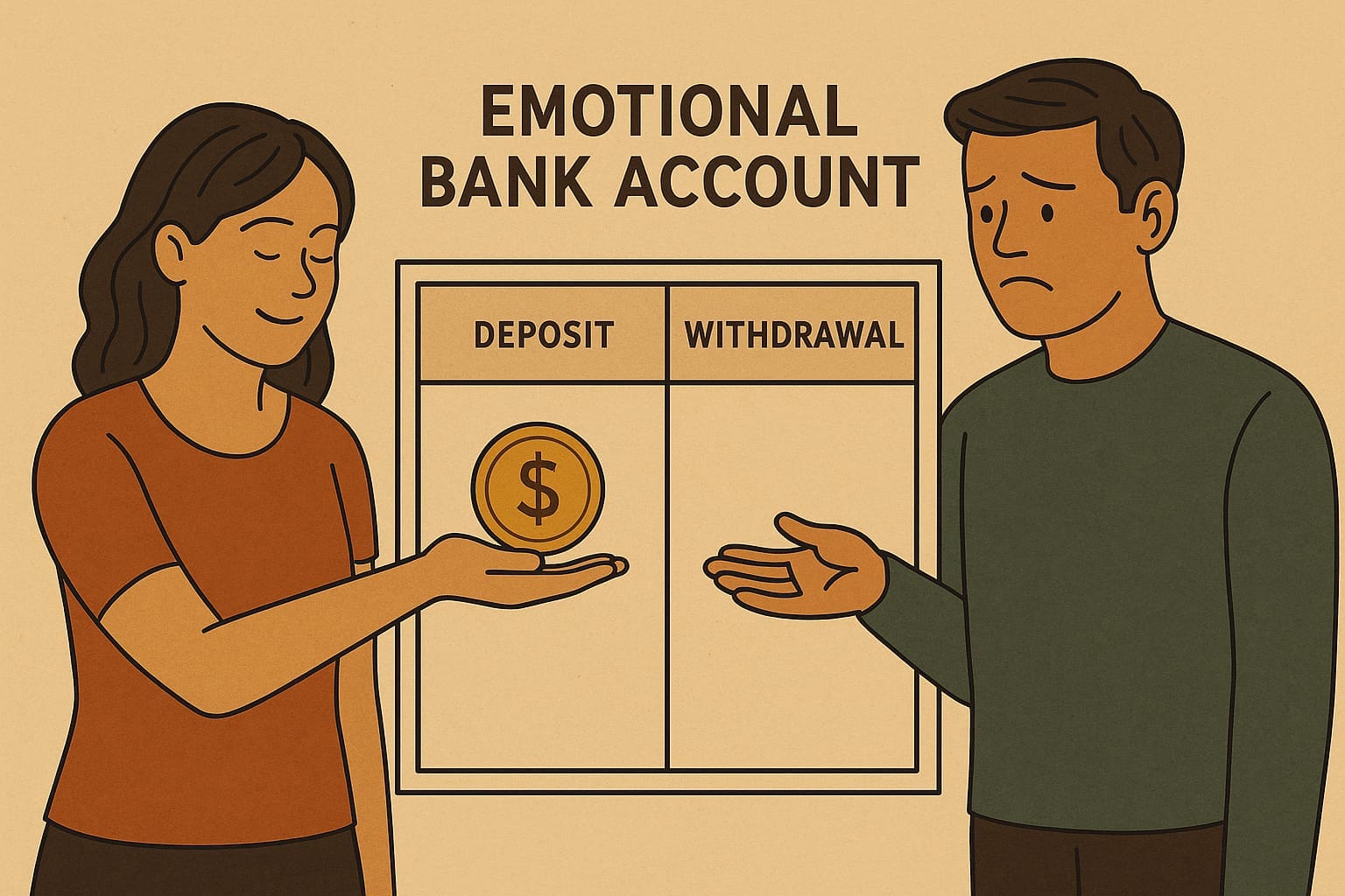 “When you smile, praise, understand, or support your partner, you make deposits. When you criticize, ignore, or hurt, you make withdrawals. If you withdraw too much, the account goes into overdraft—and love turns into resentment.”