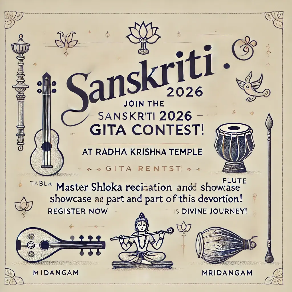 The Sanskriti 2026 Gita Contest at Radha Krishna Temple Dallas arises from this understanding. The contest itself is not the goal; it is a means supportive structure that encourages children to engage with the Gita earnestly, to practice with care, and to offer their learning as an act of devotion. What matters is not performance alone, but the inner process that unfolds through regular recitation and reflection.