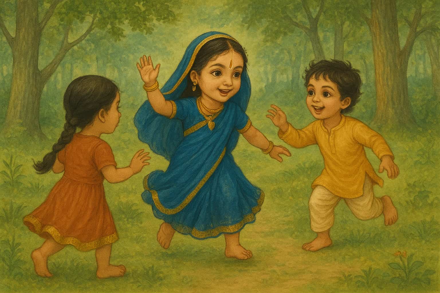 Little Radha was once playing with her dear friends, the sakhis, near her father Vrishabhanu’s palace in Barsana. Their laughter filled the air, their games echoing the carefree joy of childhood. Yet, amidst this innocent play, something happened that startled young Radha deeply, something she had never encountered before.