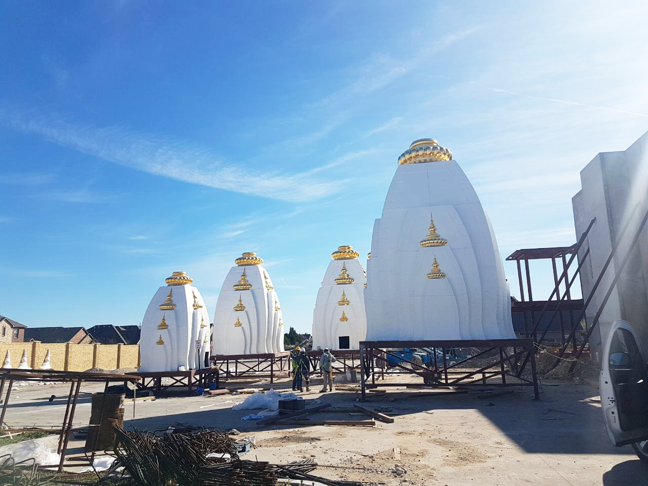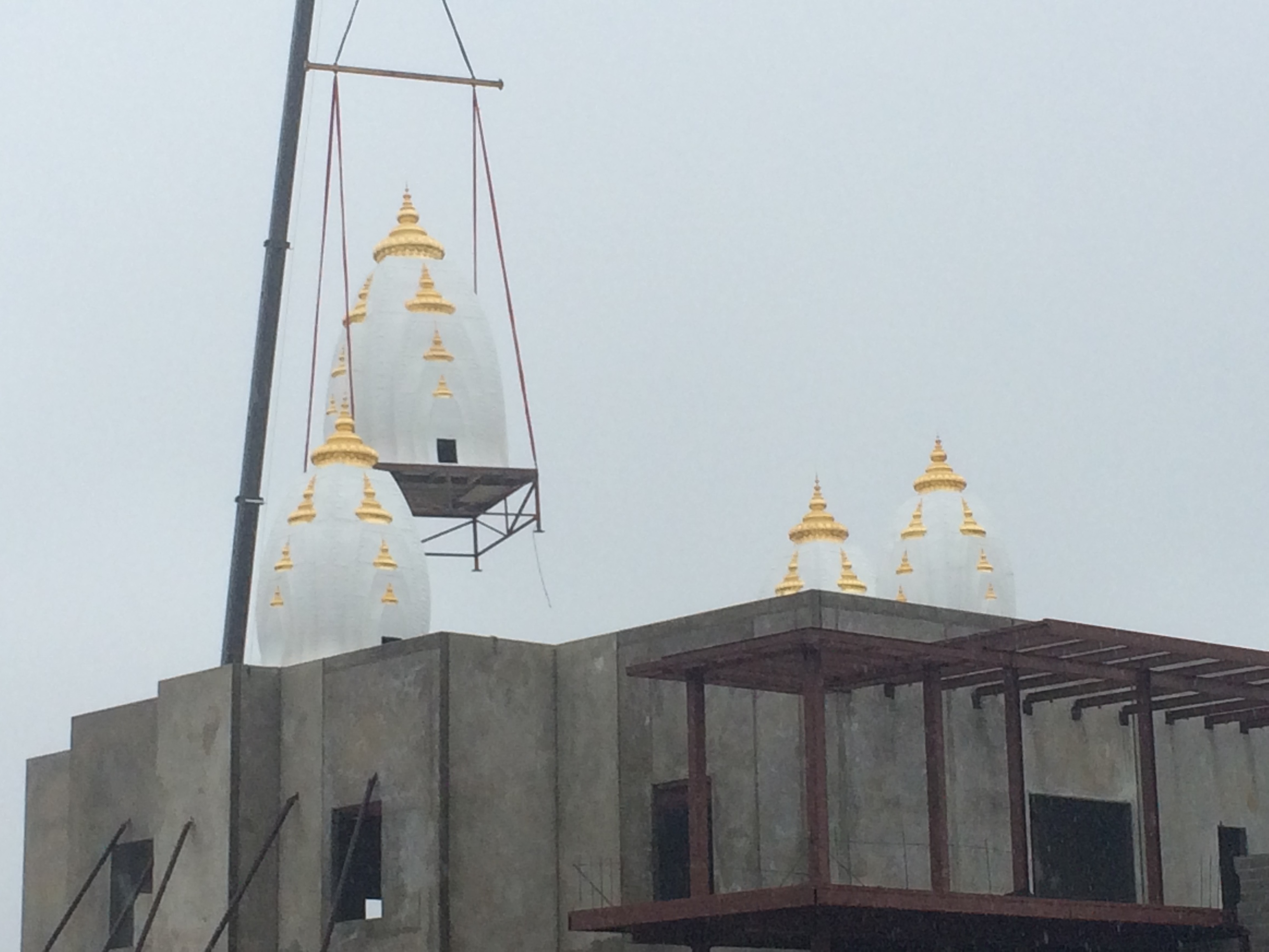 Yesterday, the shikhars were installed on the rooftop of the Radha Krishna Temple. Against the backdrop of the whitish cloudy sky, the white shikhars with their golden adornments appeared as if they arrived from the divine realm. The purity of the white decorated with gold decor gives you the sense that the deities have already descended to consecrate the temple.