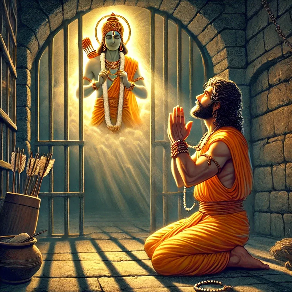 So, after twelve years, Shree Ram gave Ramadasu a vision of his past life where he had needlessly tortured a parrot in a cage out of sadistic delight for twelve years. Shree Ram revealed that his pitiable state was due to his past karma. He also blessed Ramadasu with another realization, that in these challenges lay the opportunity to purify himself. Shree Ram also said that He could get Ramadasu out of prison but asked if he would want that option if bearing the consequences of his karma was better for him.