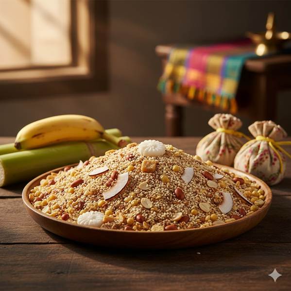 A mixture of sesame seeds, peanuts, fried gram, jaggery, and coconut, shared hand to hand, reflects gratitude, generosity, and the joy of community.