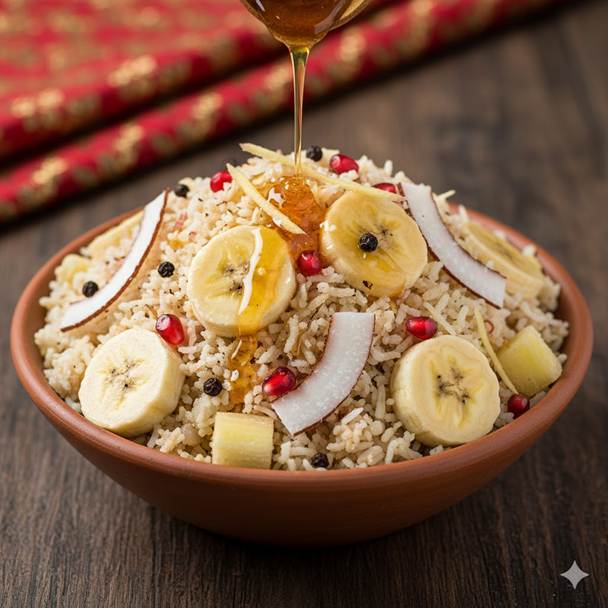 A simple, uncooked offering of rice, milk, honey, banana, and optional pomegranate or cottage cheese. Devotion is measured by love, not effort.