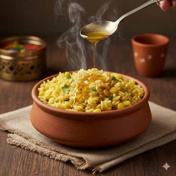 - Top: Drizzle the tempered ghee over the khichdi before serving.