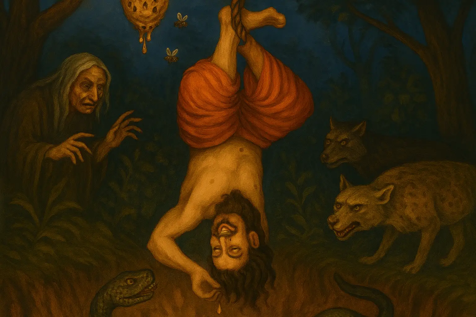Hanging upside down by a vine, he noticed a snake waiting below, ready to bite him. Above, two mice, one black and one white, began gnawing at the vine. Meanwhile, bees stung his face, and a beehive dripped a few drops of sweet honey into his mouth. Despite his peril, the man smiled, savoring the honey.