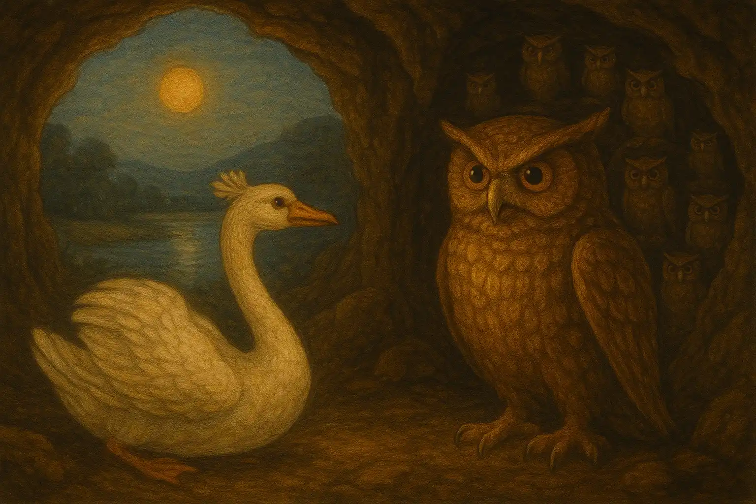 One day, a swan and an owl argued about whether it was day or night. The owl, unable to bear the brightness of the sun, declared that it was nighttime because it could not see. The swan laughed, saying it was midday, but the owl insisted otherwise. Frustrated, the owl dragged the swan into a dark cave full of other owls, who ridiculed the swan for claiming it was day.