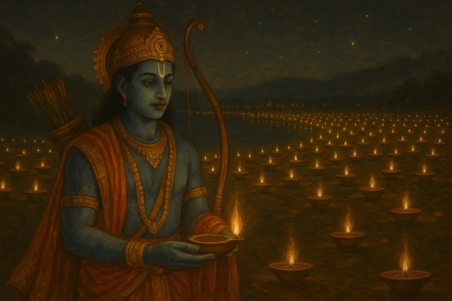 When Ram was exiled from Ayodhya due to the intrigues of Queen Kaikeyi, the entire city was plunged into sorrow. For fourteen long years, the people waited in hope, their hearts yearning for their Lord’s return. When that day finally arrived and Lord Ram, Mother Sita, and Lakshman returned to Ayodhya after vanquishing Ravan, the citizens celebrated with unbridled joy. They lit lamps across every street, every home, every heart, to welcome the light of righteousness back into their lives.