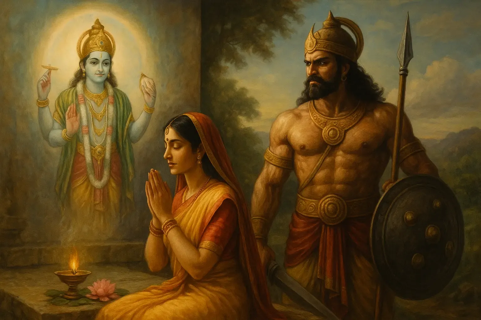 “Your devotion is pure and eternal, Vrinda. You shall be remembered always. You will be born again as the sacred plant Tulsi, worshiped in every home. And one day, I myself shall marry you.”