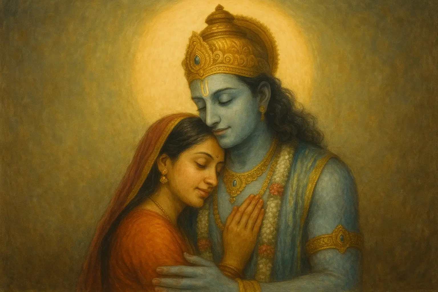 As the conch blew and the aarti flame circled, Riya felt her heart swell with peace. The moment was not just holy; it was timeless — the celebration of love that transcends worlds, where faith weds divinity, and the home transforms into a temple of grace.