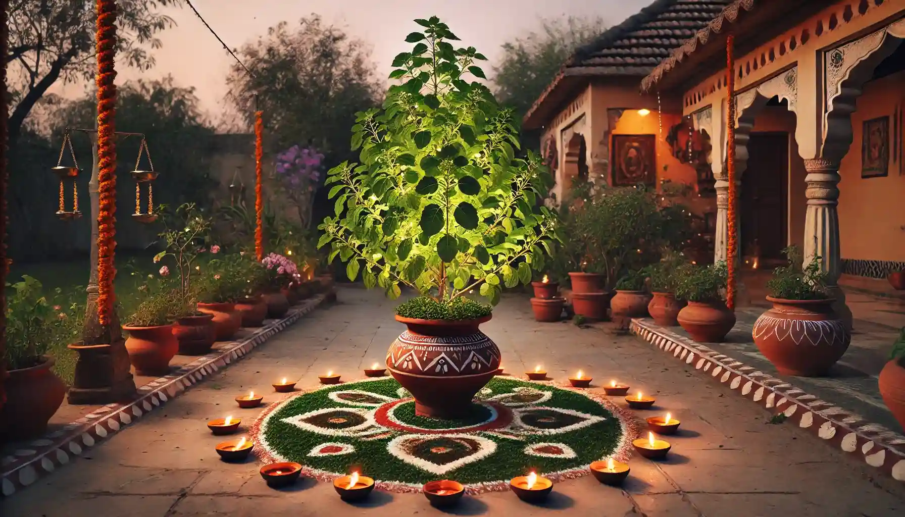 | 1. Tulsi Plant Setup | Clean the Tulsi pot or plant area; decorate with flowers, rangoli, and lights. |
