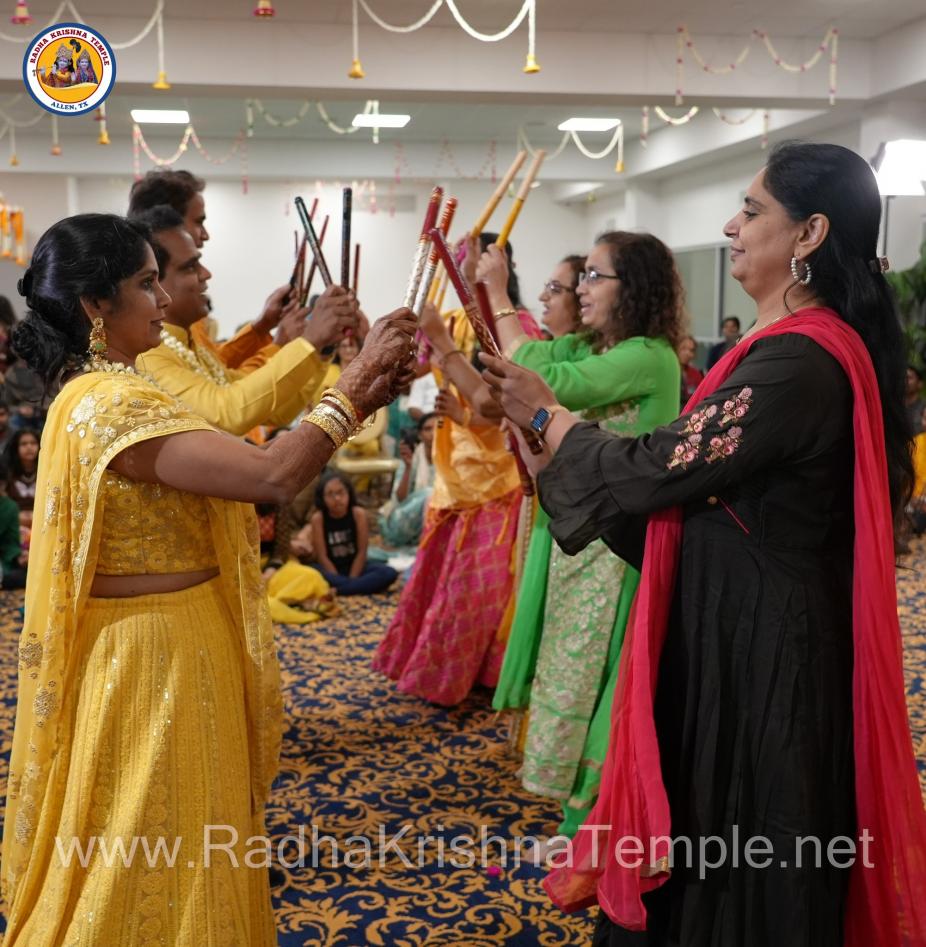 The families of the bride and the groom greeted each other and jointly invited Swami Mukundananda personally to grace the occasion of the divine wedding of Tulsi ji and Shaligram ji. Devotees lovingly applied Haldi to the deities. Everyone danced enthusiastically to Dandiya beats!