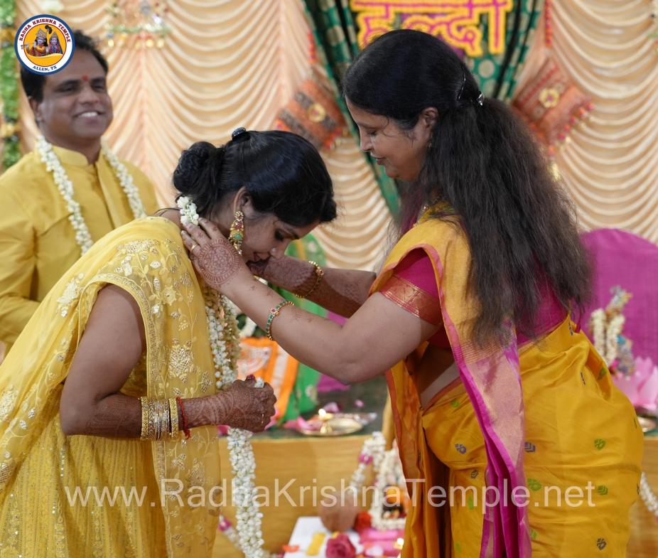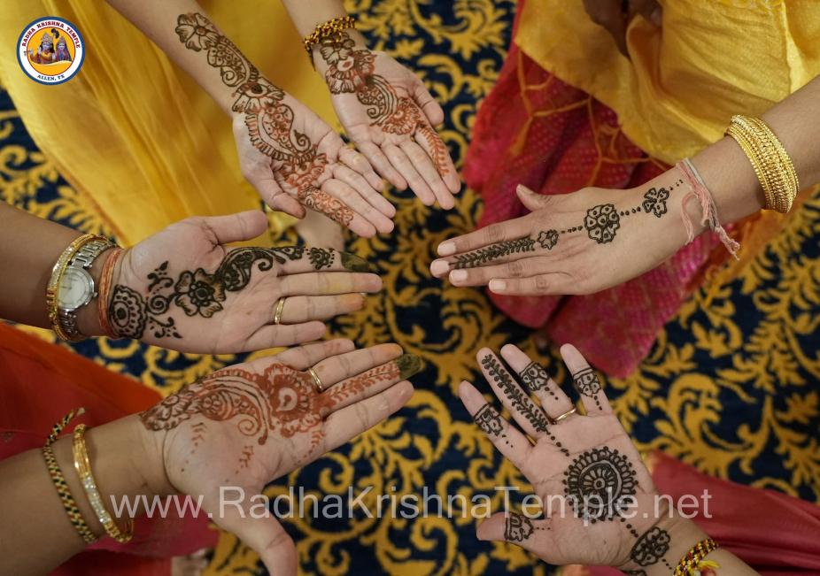 Ladies and young girls thoroughly enjoyed the Mehndi ceremony, showing off their hands adorned with exquisite, creative, and fun Mehndi designs with the names of Radha Krishna woven in.