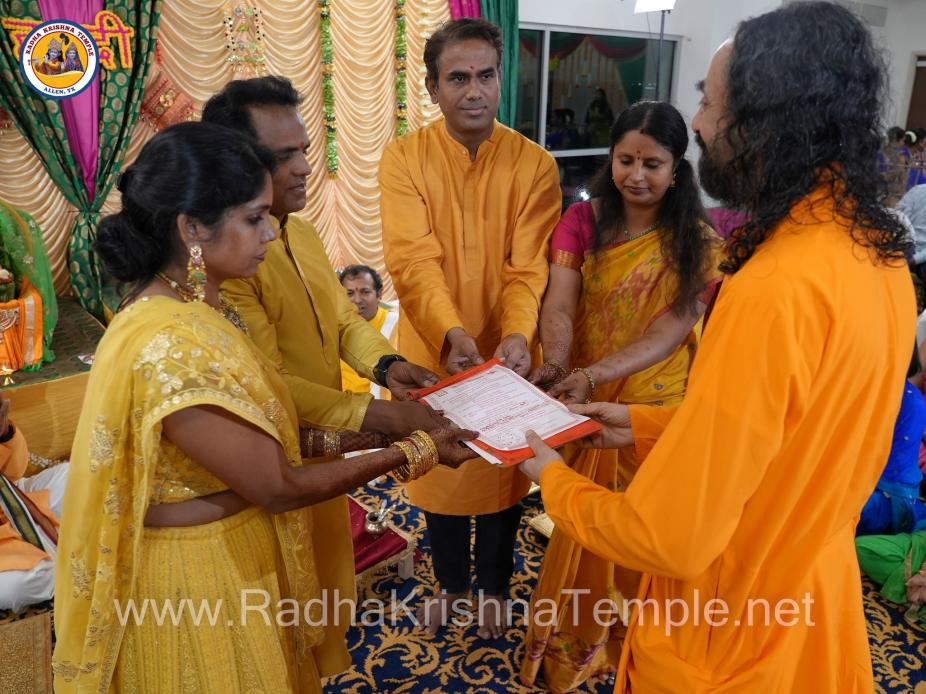 On the day of the wedding, Shree Krishna in Shaligram Swaroop and Tulsi Devi were welcomed by devotees with alacrity and merriment. The wedding rituals were performed as hundreds of devotees, who had offered their own sevas in the form of jewelry, flowers, fruits, garments, etc. looked on with love. The whole event was full of blissful moments.