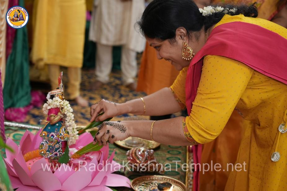 Ladies and young girls thoroughly enjoyed the Mehndi ceremony, showing off their hands adorned with exquisite, creative, and fun Mehndi designs with the names of Radha Krishna woven in.