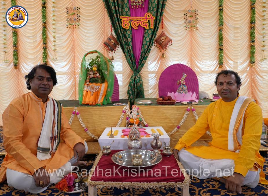 The families of the bride and the groom greeted each other and jointly invited Swami Mukundananda personally to grace the occasion of the divine wedding of Tulsi ji and Shaligram ji. Devotees lovingly applied Haldi to the deities. Everyone danced enthusiastically to Dandiya beats!