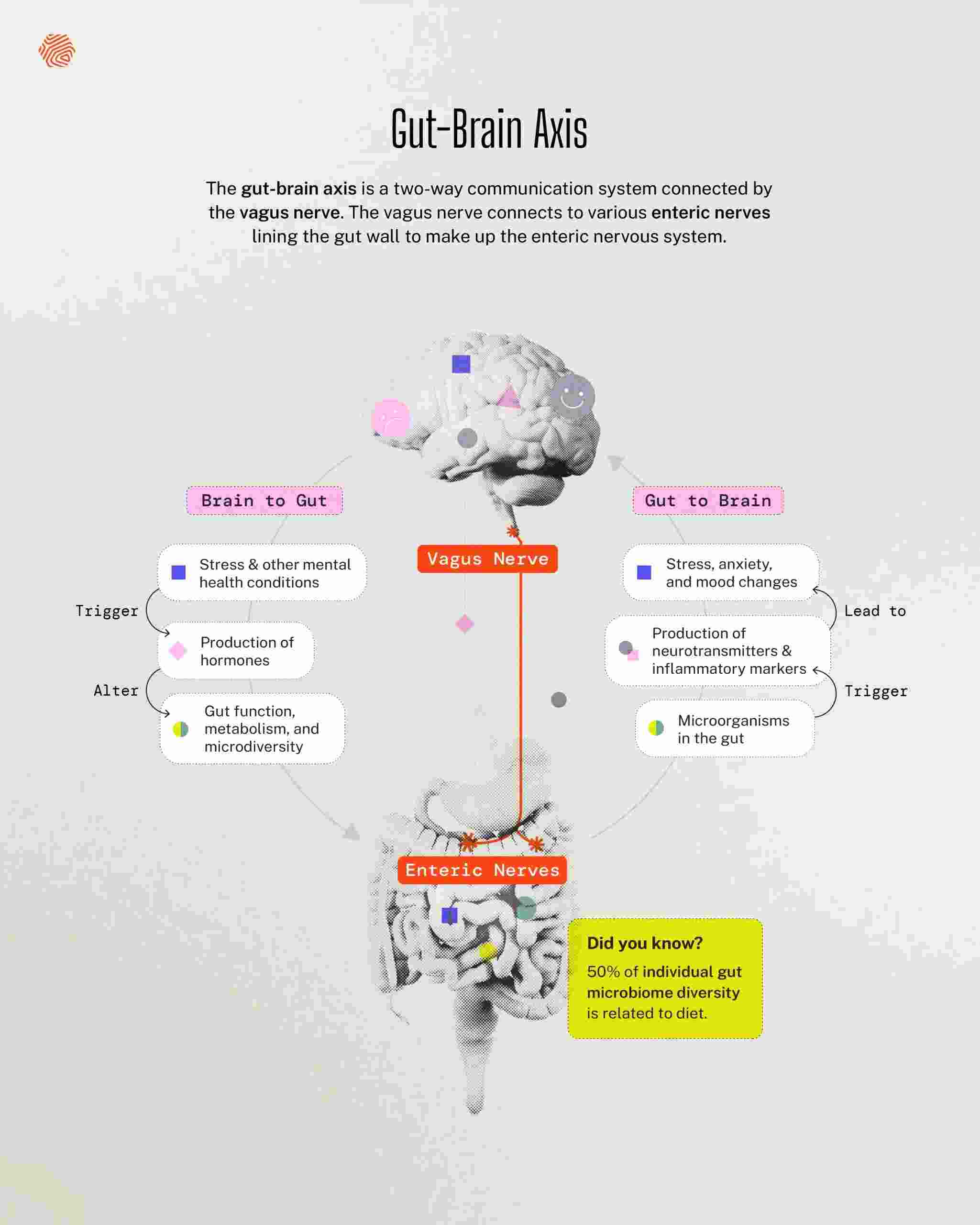 The gut is sometimes referred to as the "second brain." Diet and gut health can significantly impact our mood. The Vagus Nerve acts as a key communication pathway between the brain and the gut, transmitting signals that influence digestive processes. Enteric Nerves are part of the enteric nervous system (ENS), a neural network in the GI tract that controls digestion. If unhealthy bacteria and inflammation persist, we may develop afflictions such as depression, anxiety, insomnia, and brain fog. Hormone production of serotonin, norepinephrine, and dopamine are the neurotransmitters between the gut-brain axis that influence processes like gut motility, digestion, and immune function. The bacteria present in the gut can significantly impact the production of neurotransmitters.