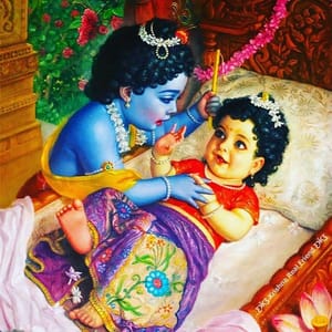 Their worries eased when Nanda Maharaja and Yashoda visited King Vrishabhanu’s home with their young son, Krishna. As Krishna came near Radha’s cradle and touched her, she opened her eyes for the very first time. This sacred moment fulfilled a divine vow—Krishna had promised Radha that, during their earthly pastimes, his face would be the first she would ever behold.
