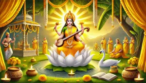 It was an early morning in the small town of Vrindavan, where the golden sun-rays began to break through the clouds, casting a soft light across the temples and gardens. On this day, the streets were alive with the sound of drums, chanting, and laughter. It was Vasant Panchami, a day when people gather in worship, offering their prayers to Goddess Saraswati, the goddess of knowledge, wisdom, and arts.