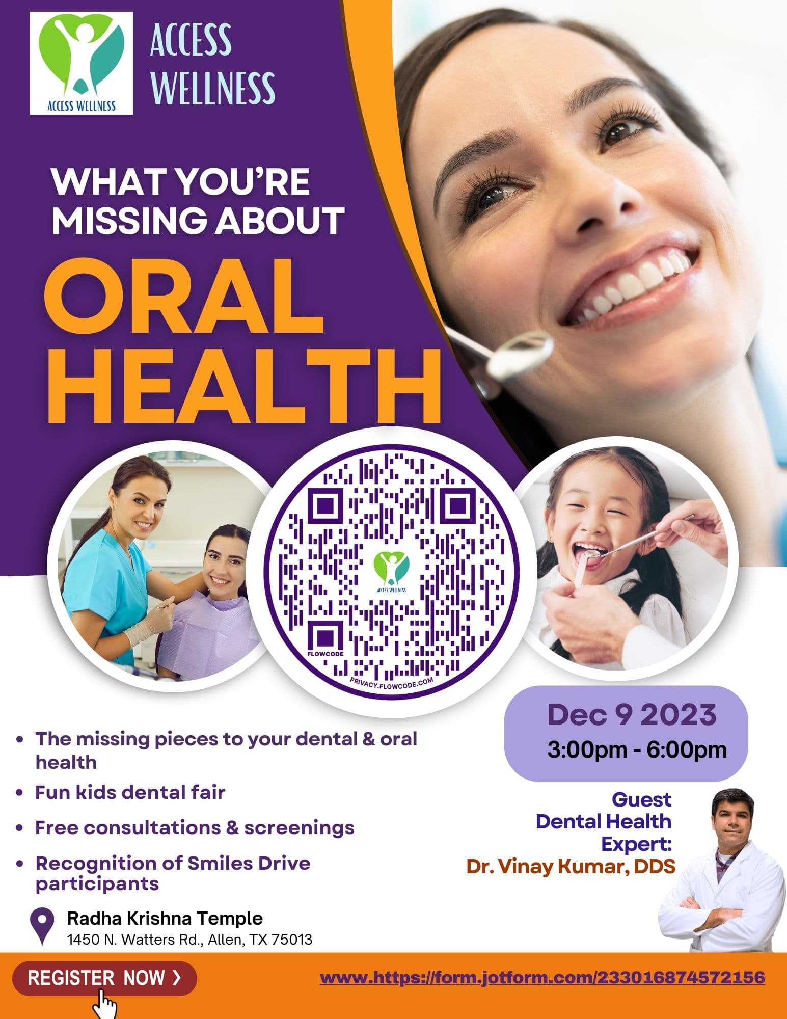 | 5 PM - 6 PM | Free Individual Dental Consultations (in person only) | With Dr. Vinay Kumar, DDS | Walk-in (First come, first serve) |