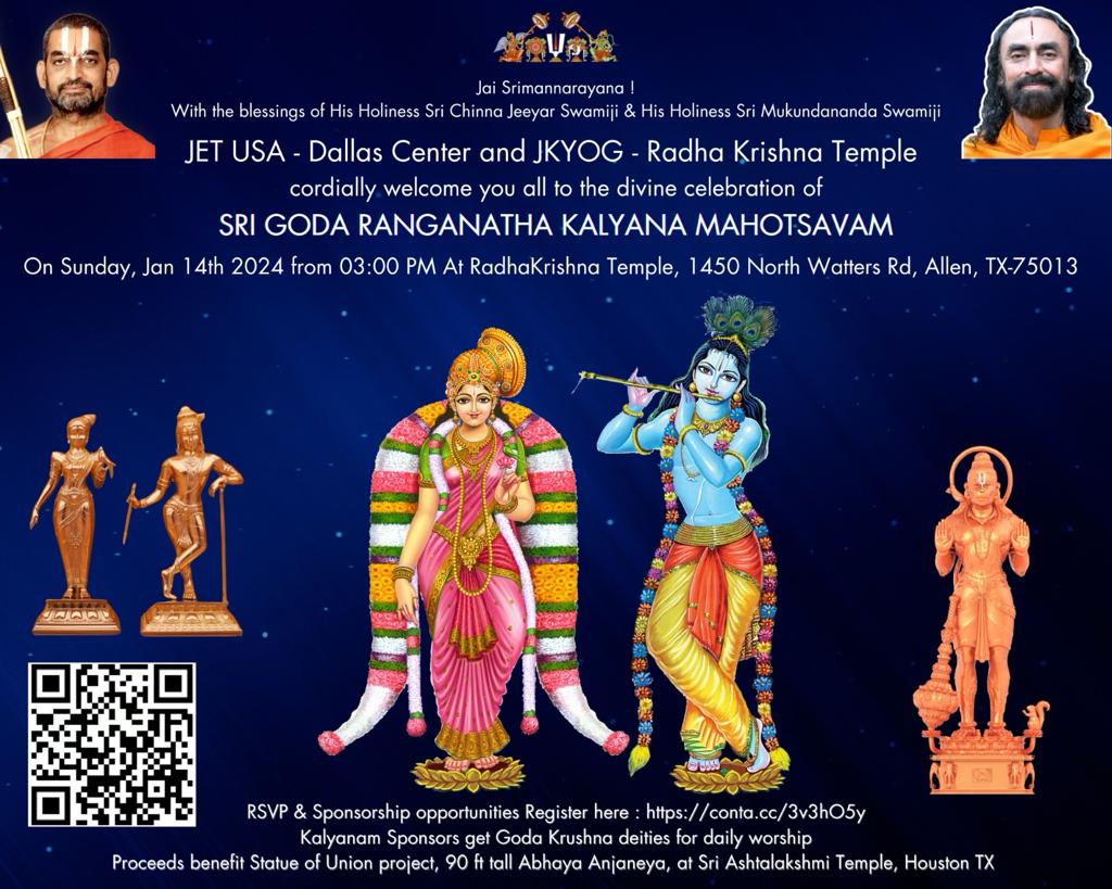 Radha Krishna Temple and JET USA - Dallas Center invite you to join the Dhanurmasa pooja everyday and special Shri Godadevi & Shri Krishna Kalyanam celebration on Sunday, January 14th, 2024.