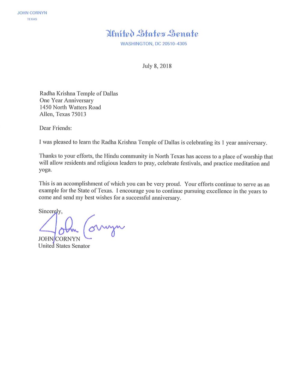 Letter from Senator John Cornyn