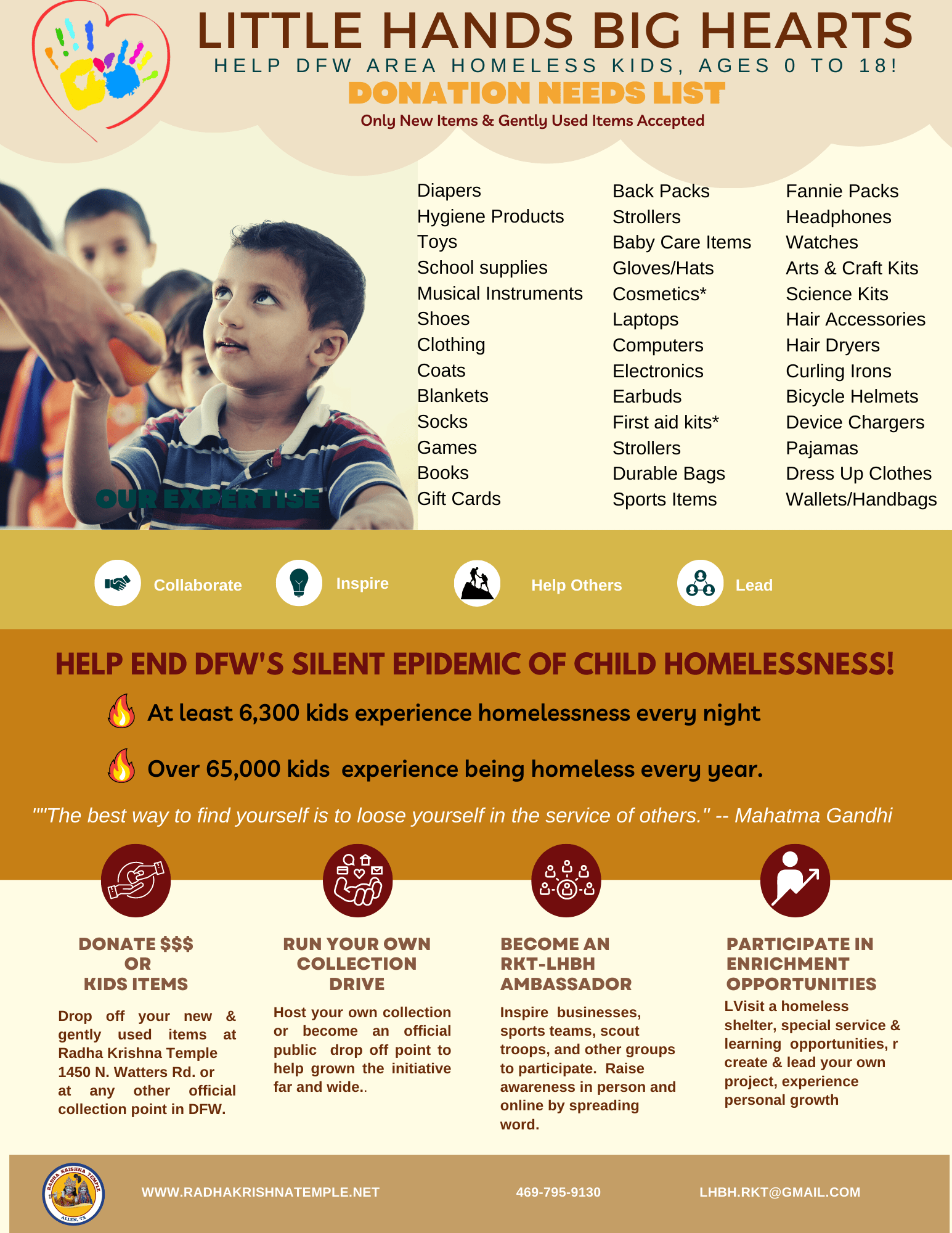 Diapers, Personal hygiene items, Toys, School supplies, Musical instruments, Shoes, Clothing, Coats, Blankets, Socks, Games, Books, Gift Cards.