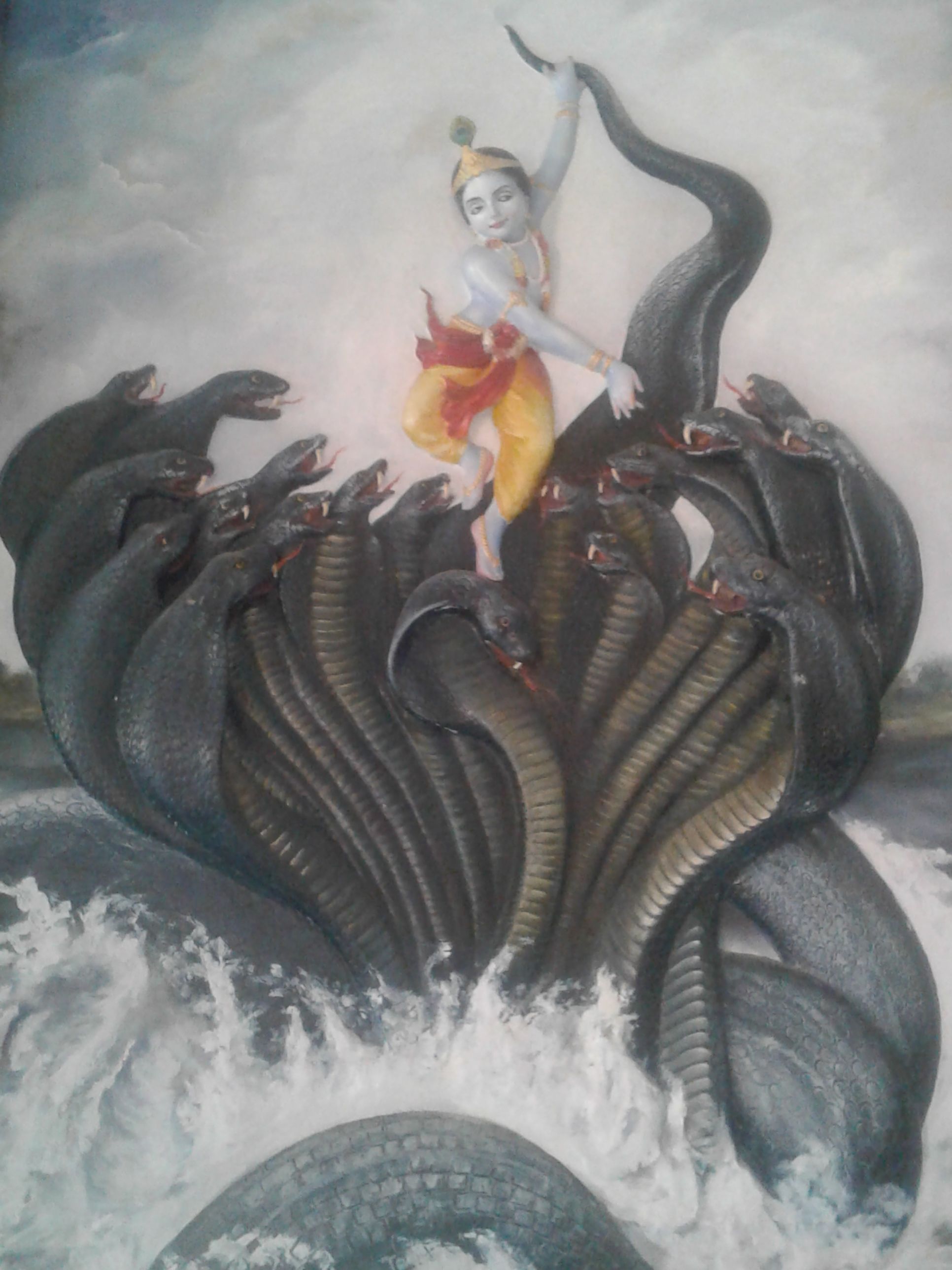 Shree Krishna wanted to ensure that they were not harmed. Shree Krishna saw their grief and started to quickly expand His body size to the point that Kaliya thought that his tail would burst, so he let go of Shree Krishna. Shree Krishna quickly swam up to the surface of the water with Kaliya in hot pursuit. Kaliya released hundreds of hoods in an attempt to scare and capture Shree Krishna. However, the Lord jumped from hood to hood as if in a divine dance, suppressing Kaliya until he was severely injured and struggling for life. Blood started spewing from his mouth.