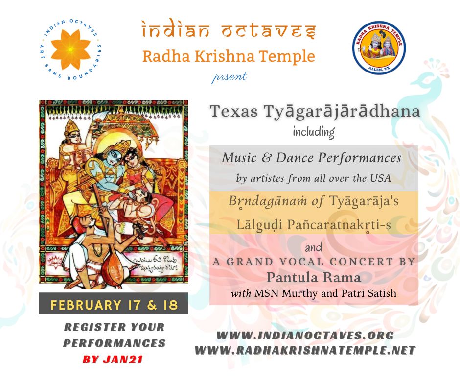 Participants who are interested in solo singing of Tyagaraja Kritis or group singing of the Pancharatna Kritis, or playing an instrument (violin, veena, flute, etc.), can register to participate.