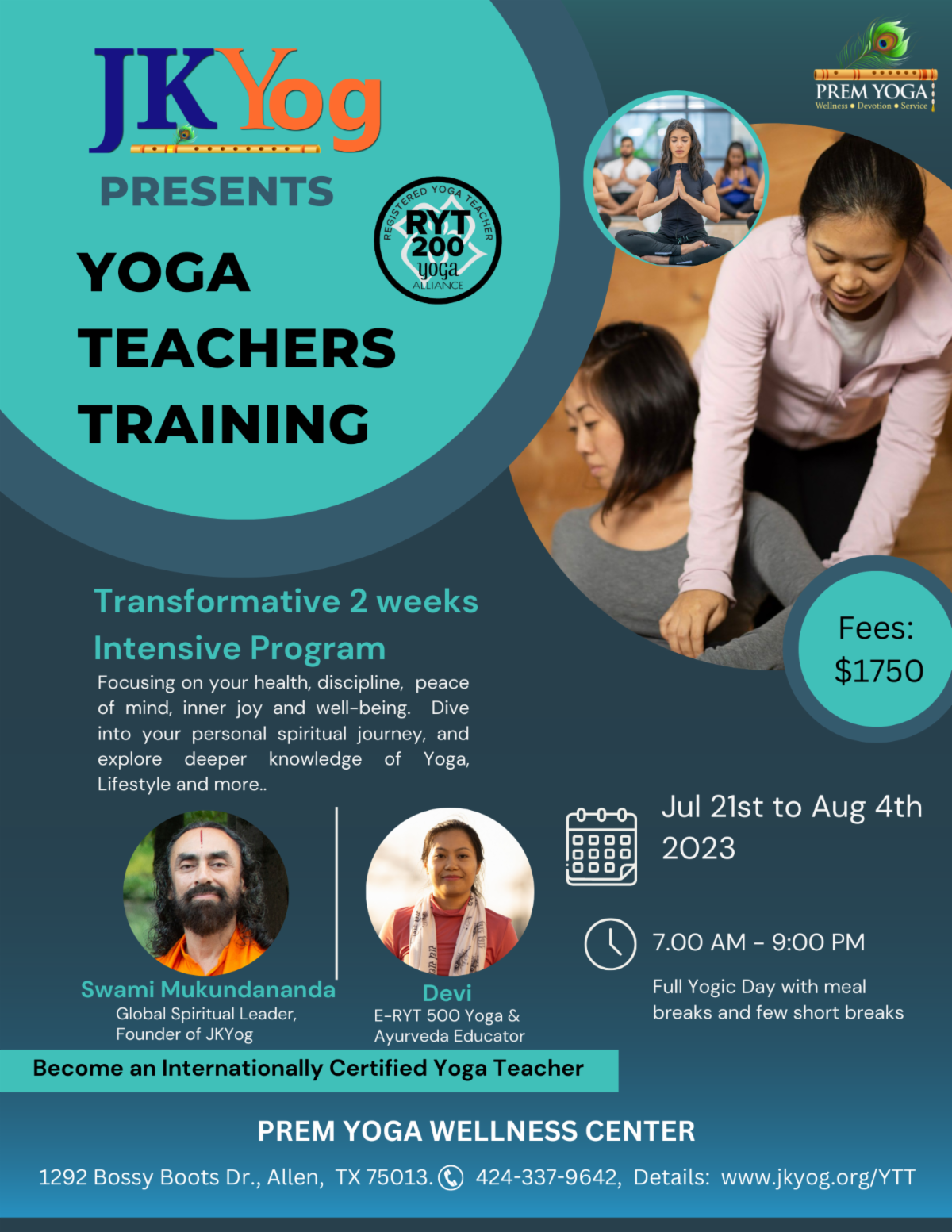 The word “Yog” means a union of the mind with God. If you are a yoga enthusiast, we invite you to participate in a dynamite program to enhance the body, mind and soul. It is JKYog’s Prem Yoga 200 Hours Teacher Training (YTT)! Become a certified yoga teacher!