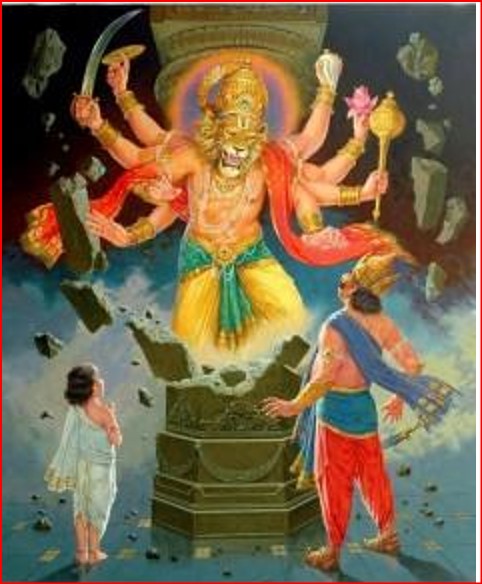Hiranyakashipu then asked Prahlad to show where God could be found. Prahlad pointed in all four directions and replied that God was everywhere, in Hiranyakashipu, in himself, in the blade of grass and in the stone pillar. Hiranyakashipu hit a nearby stone pillar because he could not see God. At that moment, God manifested through the stone pillar as Lord Narsimha, in the form of a half-man and half-lion. Lord Narsimha furiously took Hiranyakashipu in his lap and killed him.