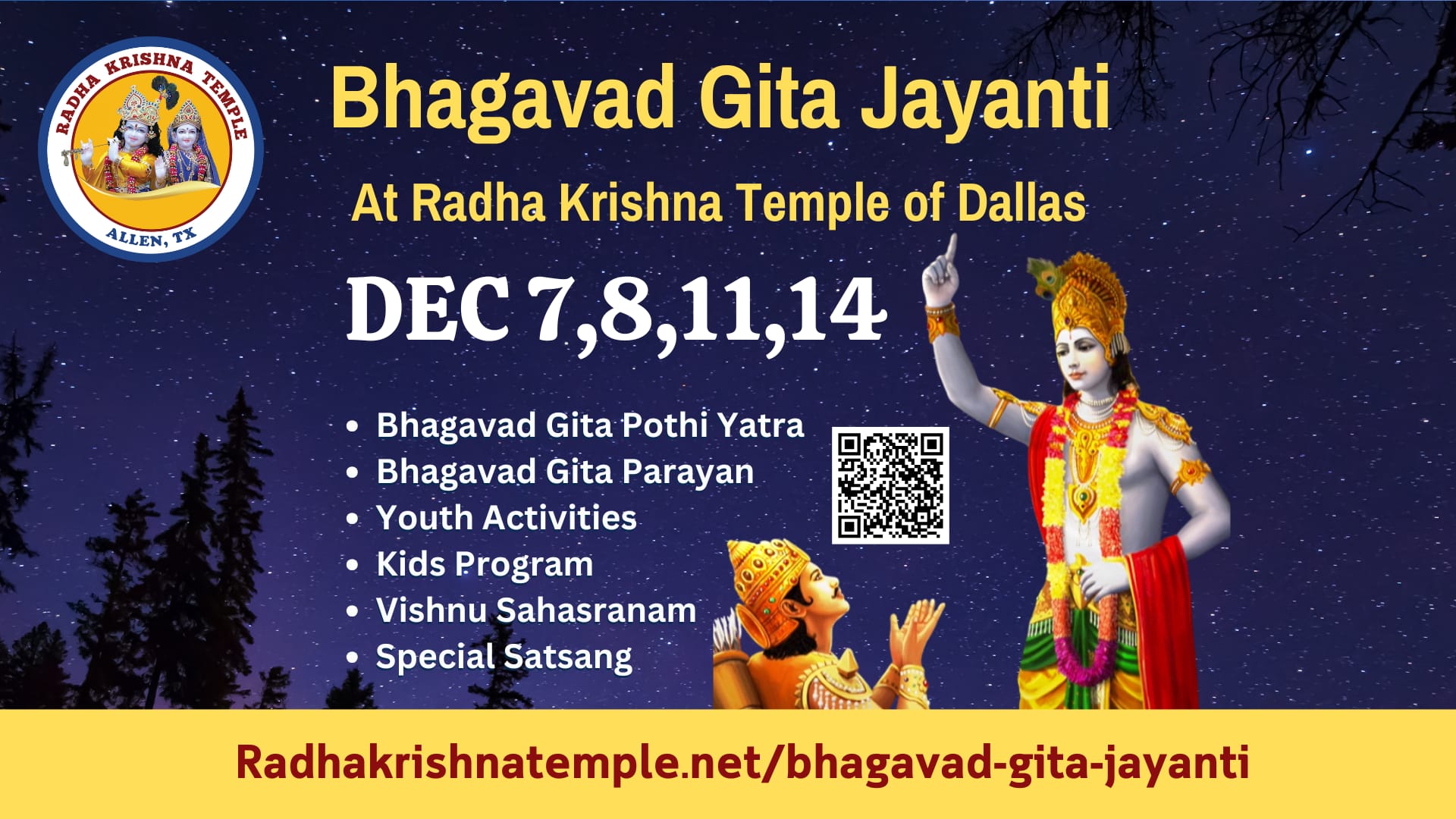 Upcoming EventsThe festival season at the Radha Krishna Temple of Dallas (Allen)hosts numerous devotional and celebratory festivals and events for the community to enable them to experience inner joy and happiness. In December, one of the most noteworthy of the programs is the Bhagavad Gita Jayanti.