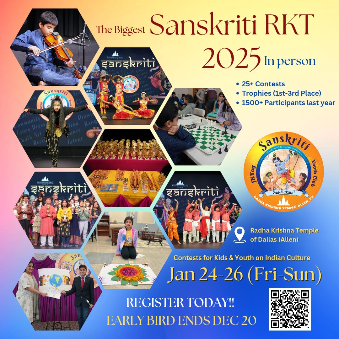 Do you have kids who are talented in the fine arts, literary or performing arts, crafts, or any other area? This is their opportunity to shine and show their devotion! It time for Sanskriti 2025 – a cultural bonanza! This program allows participants of all ages to compete in a variety of events, from singing and dancing to speech, chess, sudoku, and more!